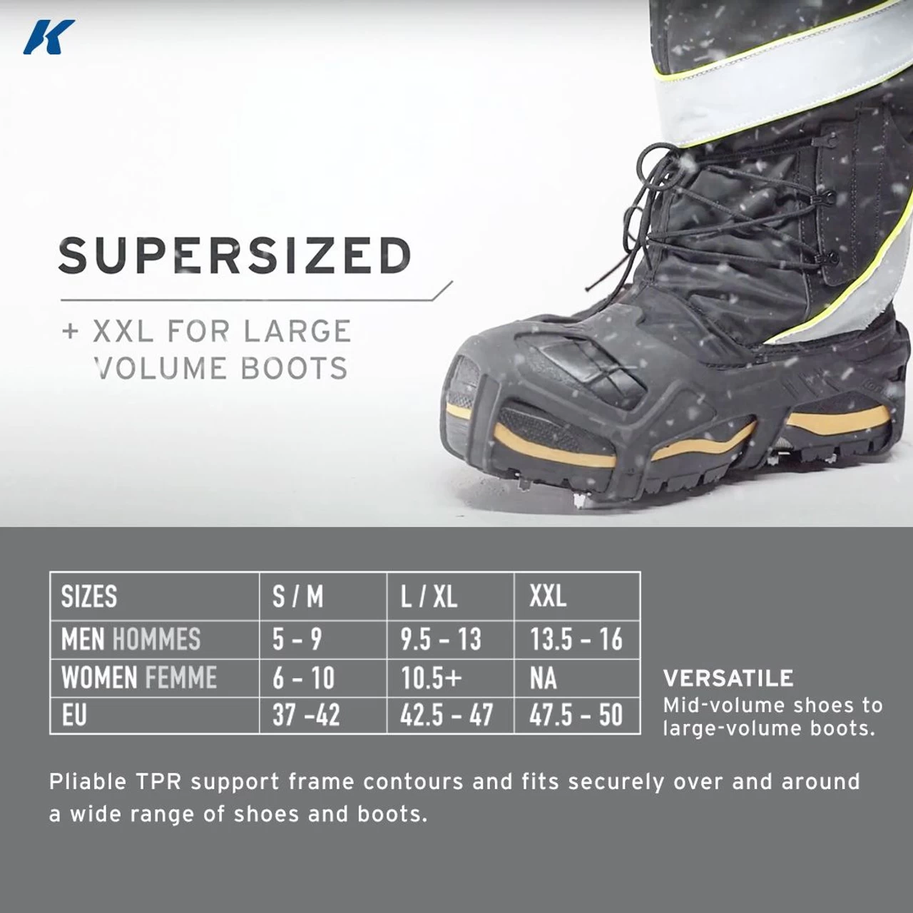 - Pliable TPR support frame contours and fits securely over and around a wide range of shoes and boots