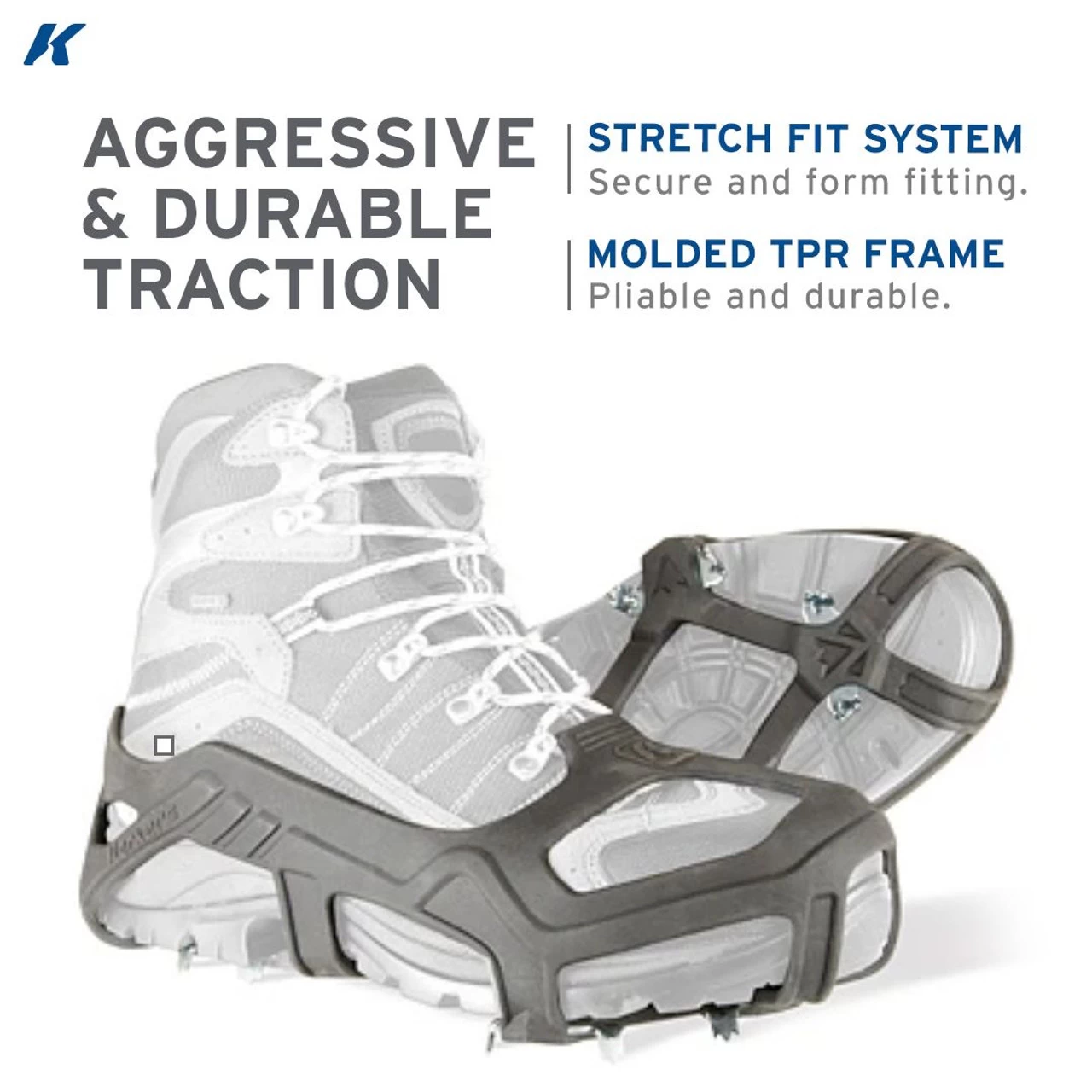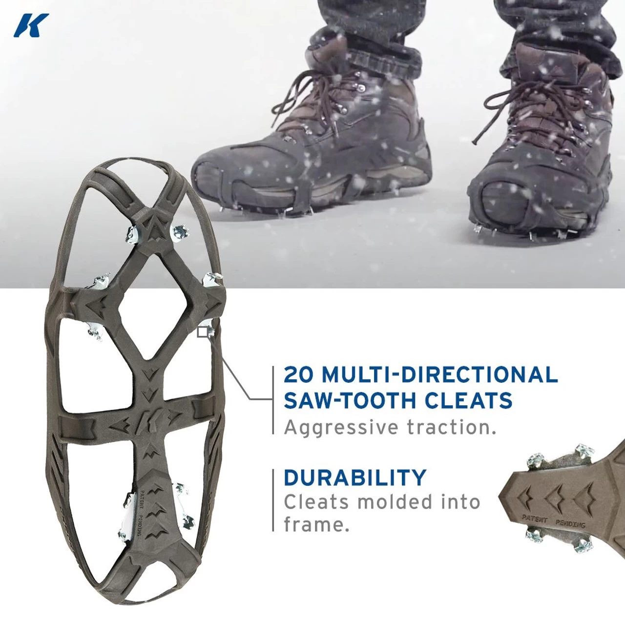 - 20 multi-directional saw-tooth stainless steel cleats offer superior grip on hard packed snow and ice